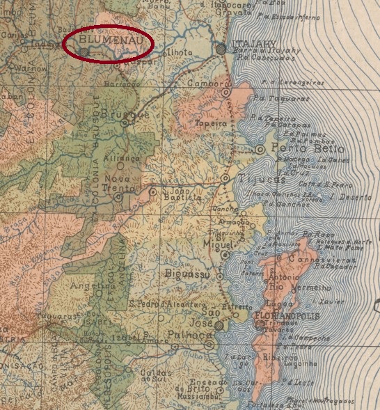 Since February 1850, this German colony existed on the south bank of the river Itajaí-Açu, 140 km northwest of the provincial capital Desterro (today: Florianópolis). The name comes from its founder, the German pharmacist and Doctor of Chemistry Hermann Blumenau (1819-1899), who returned to Germany in 1884 and died in Brunswick.