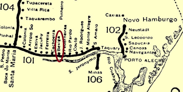 Bexiga (Bladder) station was inaugurated in March 1883 by the E.F. Porto Alegre a Uruguayana company (Main Line) and was located on the stream of the same name in the Município of Rio Pardo, 180 km west of the provincial capital Porto Alegre. The railway line went to the Cie. Auxiliaire de Chemins de Fer au Brésil in 1898, to the Viação Férrea Rio Grande do Sul in 1920 and belonged to Rede Ferroviária Federal S.A. from 1975 until its closure in 1996 (estacoesferroviárias.com.br). The station area belonged to the newly founded district of Cruz Alta (not to be confused with the town of the same name) from January 1898 and has been in the district of Bexiga since about 1940. Today, the rails are still there, but the old station was not located.