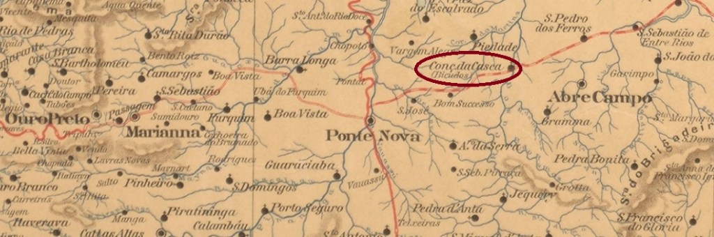 The settlement with the peculiar name Bicudos (Long Beaks) – supposedly an allusion to the long noses of the first colonist family – came into being around 1842 and was located directly on the Casca River in the município of Ponte Nova, 120 km east of the provincial capital Ouro Preto. The place rose to the status of freguesia in May 1858 and attained the status of município in August 1911.
