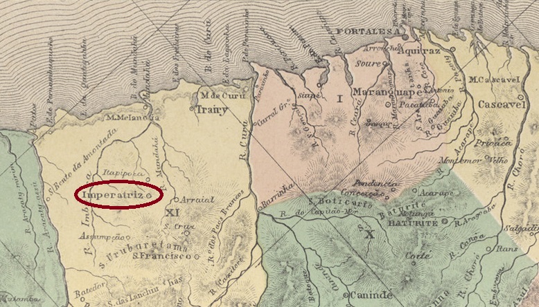This another Imperatriz in north-east Brazil also went through several place names for political reasons. From November 1840 it was the Freguesia de N. Sra. da Conceição da Serra do Martins, which belonged to the Vila de Portalegre and was located on the mountain range of the same name 380 kilometres west of the provincial capital Natal. In November 1841, it became Vila da Maioridade to celebrate the (premature) coming of age of Emperor D. Pedro II, who was not yet 16 years old at the time. In October 1847, it was elevated to the status of a town: Cidade de Imperatriz. Since the beginning of the Republic, in February 1890, the old name Município de Martins has been used again.