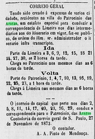 Wie im Verzeichnis der kaiserlichen Postämter (Tabella das Agencias do Correio do Imperio, Rio de Janeiro, 1885) zu lesen ist, gab es dort ein Postamt seit 1873, das im November d.Js. den Betrieb aufgenommen hat: