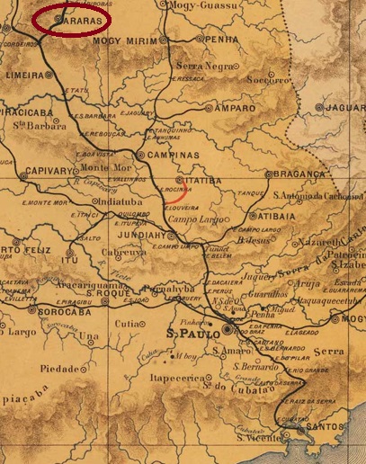 The chapel of N. Sra. do Patrocínio das Araras was built in August 1862 near the vila of Limeira, 170 km north of the provincial capital of São Paulo. The locality became a freguesia in July 1869, a vila in March 1871, and since April 1879 Araras has been a town whose name clearly evokes the beautiful colourful birds that used to be common there: