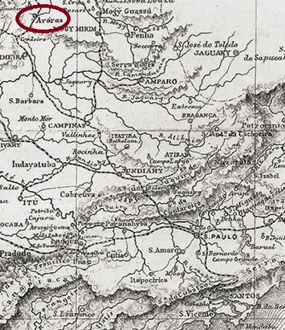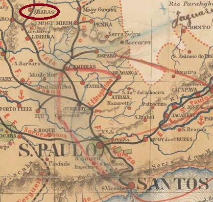 Die Kapelle von N. Sra. do Patrocínio das Araras wurde im August 1862 bei der Vila von Limeira errichtet und lag 170 km nördlich der Provinzhauptstadt São Paulo entfernt. Die Ortschaft wurde im Juli 1869 zu einer Freguesia, im März 1871 zu einer Vila, und seit April 1879 ist Araras eine Stadt, deren Name eindeutig an die schönen bunten Vögel erinnert, die früher dort häufig zu sehen waren: