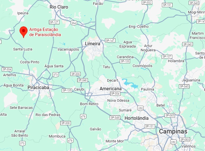 Paraíso Station was opened in 1888 by the E. F. Ytuana railway company. It was located on the north bank of the Ribeirão Fregadoli in the municipality of Piracicaba, 180 kilometres northwest of the provincial capital São Paulo. The railway line was transferred to Cia. União Sorocabana e Ytuana in 1892 and to Sorocabana Railway in 1907. From 1919 until its closure in 1966, it belonged to E.F. Sorocabana (estacoesferroviarias.com.br). Today, the tracks have been removed and the station building appears to be used as a residential building.