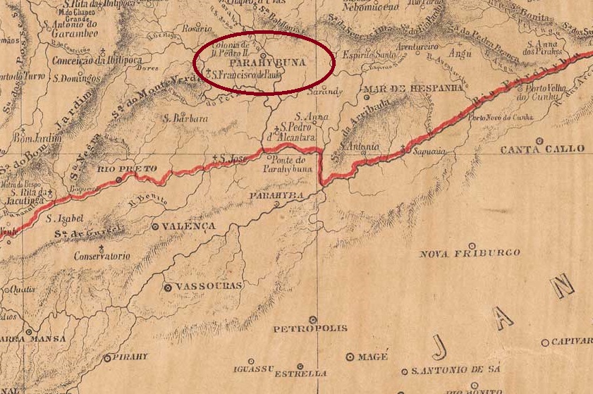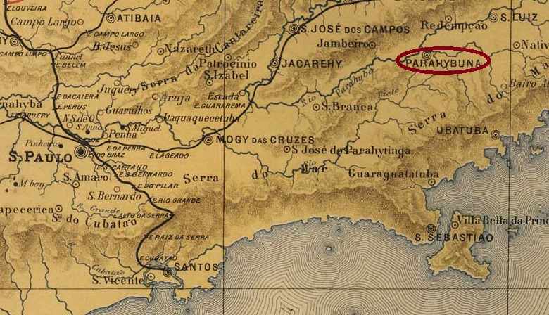 The Parahybuna (now spelled Paraibuna) is a river that rises in the mountains of the Zona da Mata in Minas Gerais. From there, it flows south to the border with Rio de Janeiro, where it joins the Rio Preto. It then continues along the border until it flows into the Parahyba (now Paraíba) do Sul near the city of Três Rios.