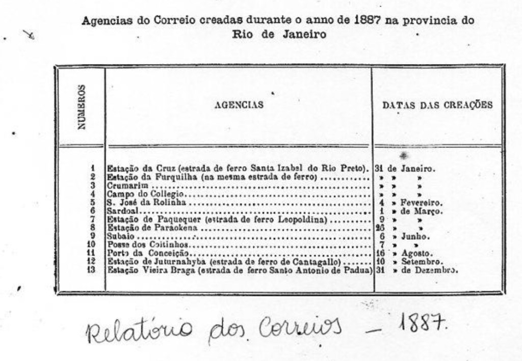 Two opening dates for the local post office have been found. Paulo Novaes first writes November 1842, but the agency was closed around July 1861, as reported by the Rio press: