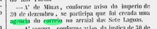 Zwei Gründungsdaten fürs örtliche Postamt wurde gefunden. Paula Sobrinho schreibt in História Postal de Minas Gerais (Belo Horizonte, 1997) dafür den August 1864. Das Datum dürfte eine Wiedereröffnung sein, denn in der Presse von Rio de Janeiro wurde vorher den 31.12.1848 bekannt gegeben: