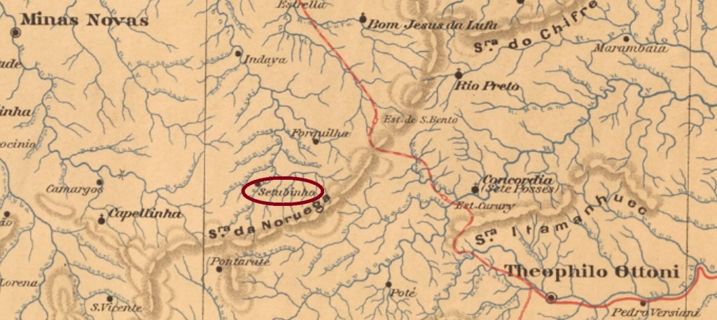 Sete Cachoeiras (Seven Waterfalls) was, as of June 1876, a district of Itabira located on the south bank of the Santo Antonio River, 250 km north of the provincial capital Ouro Preto. In September 1884, it changed to the newly founded município of Sant’Anna dos Ferros, which has only been called Ferros since September 1923. And that is how it has remained until today.