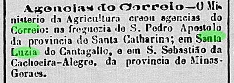 Laut Nova Monteiro (Administrações e Agencias Postaes do Brasil Imperio, in Brasil Filatelico/RJ, 1934-5; Reprint SPP 1994-1999) entstand das örtliche Postamt im September 1845. Da aber sowohl Paula Sobrinho (História Postal de Minas Gerais, Belo Horizonte, 1997) als auch das Verzeichnis der kaiserlichen Postämter (Tabella das Agencias do Correio do Imperio) von 1885 behaupten, dies sei im März 1864 geschehen, war die Agentur wohl zwischendurch geschlossen.
