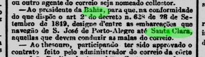 Hier haben wir wieder mit dem faszinierenden Fall eines Postamtes zu tun, dessen turbulente Geschichte viele Kapriolen schlug. Santa Clara war ursprünglich eine Kolonie im Município von São José de Porto Alegre (heute: Mucuri), die am Ufer des Mucuri über tausend km südlich der Provinzhauptstadt Salvador da Bahia entfernt lag. Da sie direkt an der Grenze zu zwei weiteren Provinzen (Minas Gerais und Espirito Santo) strategisch lag, wurde sie jahrzehntelang ein begehrtes Objekt. Santa Clara sollte mehrmals die Seite wechseln und schaffte es sogar, auf der gleichen Karte zwei unterschiedlichen Provinzen zugeordnet zu sein (siehe Abb. ganz oben).