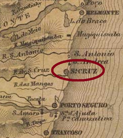 This Santa Cruz was the former Freguesia of Aldeia Velha (= Old Village), established in December 1837 in the municipality of Nova Almeida, situated over 80 km north of the former province capital Villa do Espírito Santo (now Vila Velha). In April 1848 it ascended to a villa in own municipality, named Santa Cruz, which became a town in March 1891. In December 1943 the toponym was changed to the actual Aracruz.