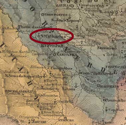 Here we have once more a fascinating story about a post office in a locality with a turbulent history. Santa Clara began as a colony of the municipality of São José de Porto Alegre (now the town of Mucuri) in the Bahia province, situated on the Mucury River, over a thousand km south of the province capital Salvador. Since it was located near the border to two other provinces (Minas Gerais and Espírito Santo), for some strategic reason it must have been disputed among them, for it not only has caused often changes in the border lines, but also appears in different provinces on maps from the same year and author (see above).