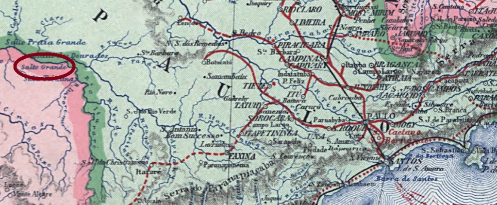 The freguesia of Salto Grande do Paranapanema was created around 1880 on the north bank of the Paranapanema River in the municipality of Santa Cruz do Rio Pardo, almost 400 km west of the province capital São Paulo. Salto Grande refers to the big waterfall provided naturally in the location near the mouths of the Pardo and Novo Rivers, where eventually a hydroelectric power plant has been built. The locality was made a district in April 1891, a villa in December 1906, and since October 1922 it is the municipality of Salto Grande.