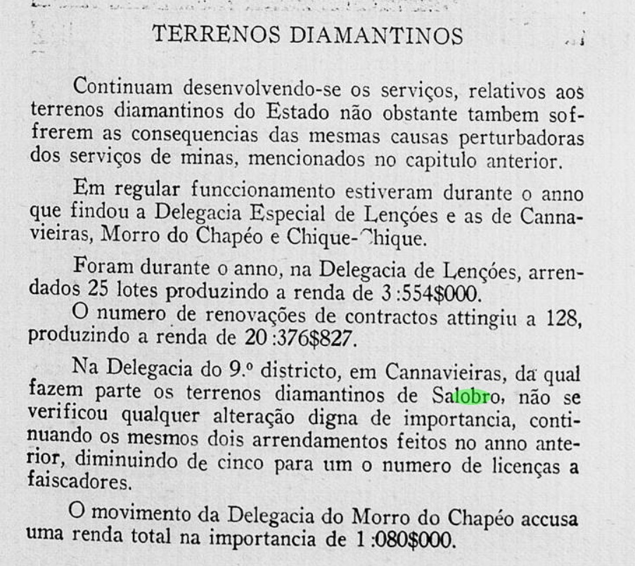 Durch den Diamanten-Abbau wurde Salobro bereits im Juni 1886 zum Distrikt Cannavieiras, aber das Edelstein-Potential wurde binnen 40 Jahren ausgeschöpft. In 1922 war nur ein einziger Diamantensucher übrig geblieben, der offiziell registriert war: