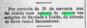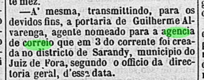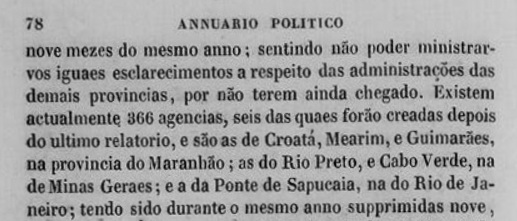 Allerdings hat Reinhold Koester (Carimbologia V) das Jahr 1881 als Entstehungsjahr angegeben. Nun wurde diese Agentur in den Berichten des Provinzpräsidenten (Relatorio do Presidente da Provincia) für 1867, 1870 und 1877 erwähnt, und im kaiserlichen Postführer (Guia Postal do Império) aus 1880 ist sie auch aufgelistet. Hier wird Koester wohl falsch liegen.