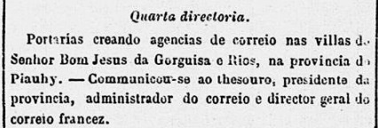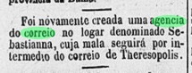 Es wurden zwei Daten für die Entstehung des örtlichen Postamtes gefunden, aber womöglich handelt es sich beim zweiten Datum um einen Abschreibfehler. Nova Monteiro schreibt in Administrações e Agencias Postaes do Brasil Imperio (Brasil Filatelico/RJ, 1934-5; Reprint SPP 1994-1999) dafür den März 1861, was durch die Presse aus Rio bestätigt wird: