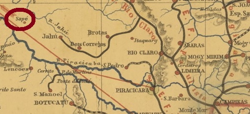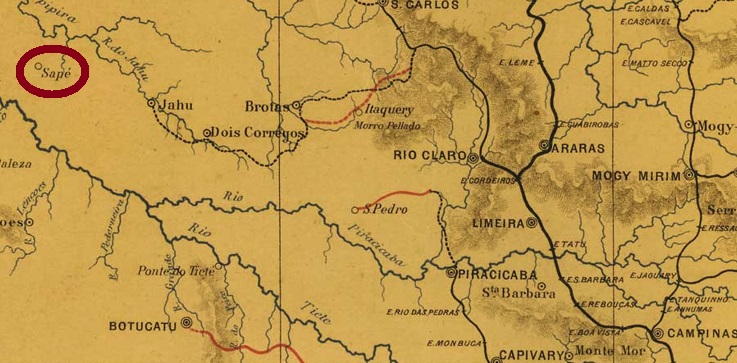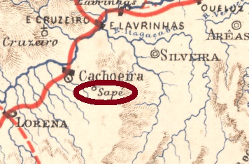 With Sapé, we finally leave the long line of Brazilian localities with saint’s names in the empire. The old village was a freguesia of Silveiras from April 1857, close to the south bank of the Rio Paraíba, more than 200 km northeast of the provincial capital São Paulo. With coffee cultivation came prosperity; the decline of this culture in the region was followed by decadence. So, in April 1887, the place became an independent município called Jatahy. The Indian word denotes both a plant of the Faseolaceae family (also called Butiá) and a variety of bee. At the end of the Empire, over three thousand people lived there. In May 1934, the place descended to the district of Cachoeira, and today it is a sparsely inhabited rural suburb of Cachoeira Paulista. Only the church of N. Sa. da Piedade reminds us of the old days: