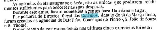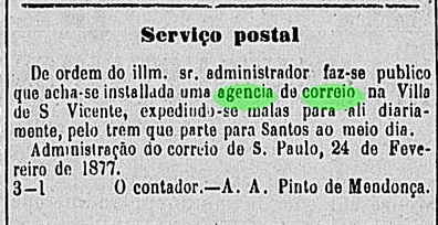 Das Verzeichnis der kaiserlichen Postämter (Tabella das Agencias do Correio do Imperio, Rio de Janeiro, 1885) listet dieses Postamt ab 1877 auf, und dessen Inbetriebnahme wurde im Februar des Jahres durch die Provinzpresse bestätigt: