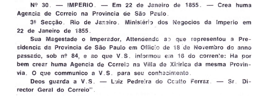 Das örtliche Postamt wurde mindestens zweimal ins Leben gerufen, wobei wir noch nicht wissen, wann das erste Mal stattfand. Da aber der älteste Poststempel auf Markenausgaben von 1843 zu sehen ist, darf man annehmen, dass die Postagentur erstmals um 1842 eröffnet wurde, als Xiririca eine Vila geworden war. Über die zweite Entstehung des Postamtes im Januar 1855 hat Aureo G. Santos in Agências de Correio Criadas e Suprimidas 1851, 1855, 1856 e 1857 (Brasil Filatélico 181, Rio de Janeiro, 1977) berichtet: