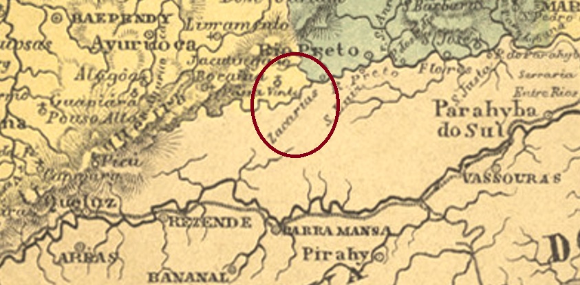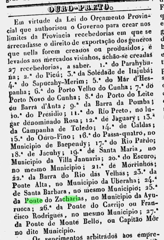 Die Zacharias-Brücke wurde über dem Rio Preto gebaut, nah an der gleichnamigen Vila und direkt an der Naturgrenze zwischen den Provinzen Minas Gerais und Rio de Janeiro, 340 km südlich von Ouro Preto entfernt. Auf der Minas Gerais-Seite wurde im Juli 1839 eine Recebedoria (Zollhaus) eingerichtet, um die Ausfuhrsteuer über Waren einzukassieren, die in Rio de Janeiro verkauft wurden.