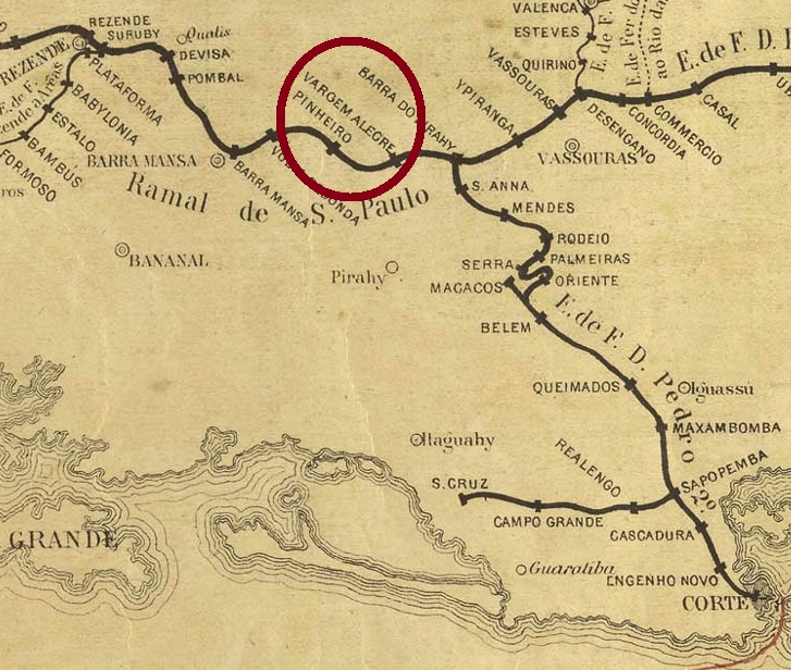 Im Juni 1865 wurde dort der Bahnhof auf der Hauptslinie der E.F. Dom Pedro II Bahngesellschaft eingeweiht. Die Strecke ging 1889 zur E.F. Central do Brasil über, von 1975 bis zur Stilllegung 1996 gehörte sie der Rede Ferroviária Federal S.A. (estacoesferroviarias.com.br). Der Bahnhof wurde im Mai 1925 zu Barão de Vassouras umbenannt. Das Verzeichnis der kaiserlichen Postämter (Tabella das Agencias do Correio do Imperio, Rio de Janeiro, 1885) listet das Bahnhofspostamt mit Entstehungsjahr 1855 auf. Dies wird ein Druckfehler sein, denn viel plausibler ist das Datum vom 31.12.1865, wie durch Paulo Novaes in agenciaspostais.com.br ermittelt.