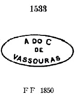 Danach gab es fünf Stempel als Doppelkreise. VEJ-0990b (Samml. Fuad Ferreira Fo.) ist ein französischer Typus mit der Inschrift VASSOURAS oben und dem Stern zwischen Klammern untern. Daten in der Mitte von 1867 bis 1874. VRJ-0990c (Samml. José A. Junges) hat dieselbe Inschrift oben, unten ist nun ( C ) zu lesen, für Cidade. Datiert ab ca. 1877 bis 1882 in der Mitte. VRJ-0990d (Samml. José A. Junges) hat oben die Inschrift CID. DE VASSOURAS, unten ist ein Ornament in Raute, das aus vier kleinen Rauten gebildet wird. Die inneren Daten wurden für den Zeitraum 1884-1887 gefunden. VRJ-0990e (Samml. José A. Junges) hat oben die Inschrift CIDE. DE VASSOURAS, unten ist das Ornament nun wie ein Hashtag. Datiert 1888-1889 in der Mitte. Schließlich kommt VRJ-0990f (Samml. José A. Junges): hier lautet die obige Inschrift lediglich VASSOURAS, unten ist ein 12-zackiger Stern, mit inneren Daten von 1890 bis 1893.