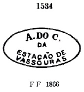 In June 1865, the train station was inaugurated there on the main line of the E.F. Dom Pedro II railway company. The line passed to the E.F. Central do Brasil in 1889, and from 1975 until its closure in 1996 it belonged to Rede Ferroviária Federal S.A. (estacoesferroviarias.com.br). The station was renamed Barão de Vassouras in May 1925. The Directory of Imperial Post Offices (Tabella das Agencias do Correio do Imperio, Rio de Janeiro, 1885) lists the station post office as originating in 1855. This will be a misprint, as much more plausible is the date of 31.12.1865, as recorded by Paulo Novaes in agenciaspostais.com.br.