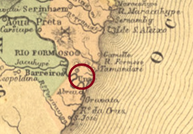 Una station was inaugurated in November 1862 by the E.F. Recife ao São Francisco railway company (Southern Line) and was then located in the Município of Água Preta on the north bank of the Una River, 120 km southwest of the provincial capital Recife. Despite the name, the station did not serve the Freguesia of Una near Rio Formoso (UPE-0730, post office since 1854), but the nearby large estate (Engenho) of Trombeta. The railway line went to the Great Western Company in 1901, to Rede Ferroviária do Nordeste in 1950, and from 1975 until its closure in 1996 it belonged to Rede Ferroviária Federal S.A. (estacoesferroviarias.com.br). Today, the station building houses a cultural foundation dedicated to the writer Hermilo Borba Filho (1917-1976).