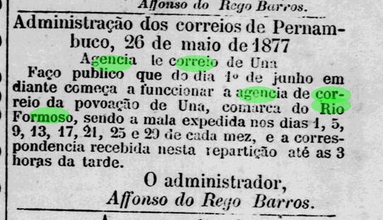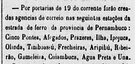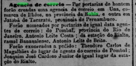 The station post office was created in December 1864, as reported by the Rio press: