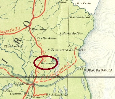 A barreira was a barrier on trunk roads where tax or toll was collected. The Barreira das Tres Barras, as R. Koester tells us in Carimbologia III, was located at the confluence of three streams (Turvo, Agua Comprida and Pirapetinga) with the Bananal River. Tres Barras was also the name of the fazenda 500 metres away, which today is a hotel. Bananal was also the name of the municipality responsible for this place, located 320 km northeast of the provincial capital São Paulo, quite before the provincial border to Rio de Janeiro.