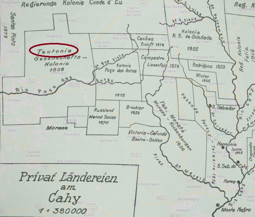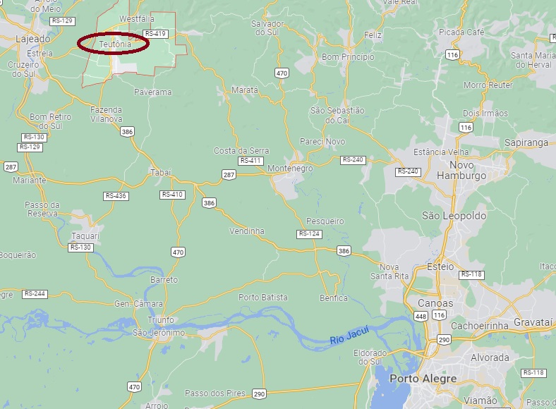As the name suggests, Teutonia was from 1858 a German colony in the Município of Taquary, located just under 110 km northwest of the provincial capital Porto Alegre. In May 1876, the place changed to the newly founded municipality of Estrella, and since October 1981, Teutônia (now with ô) has been an independent Município.
