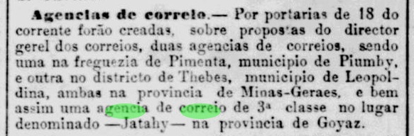 Laut Nova Monteiro (Administrações e Agencias Postaes do Brasil Imperio, in Brasil Filatelico/RJ, 1934-5; Reprint SPP 1994-1999) gab es dort ein Postamt seit Oktober 1864. Dies wird durch die Presse aus Rio de Janeiro bestätigt: