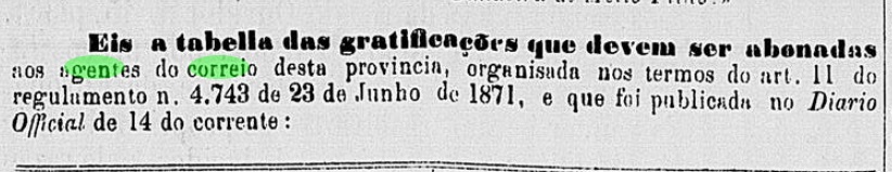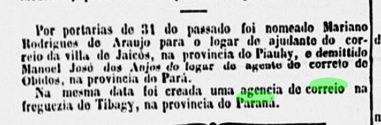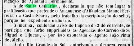 It seems it was not until 1875 that postal service resumed in Tijucas, as noted in the Provincial President’s Report for March 1876: