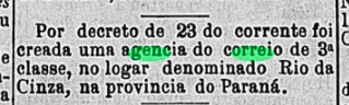 The Imperial Mail Register (Tabella das Agencias do Correio do Império) of 1885 lists a post office in Rio das Cinzas in the Parana province, which was created in 1882. This is corroborated by the press in Rio: