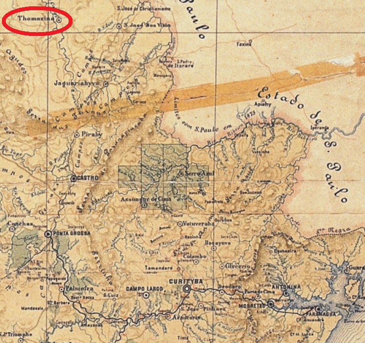 So far, no post cancel appeared under the first toponym. With dates from 1886 to 1896, there is TPR-0225a (Coll. José A. Junges): a double circle with the inscriptions THOMAZINA above and PARANA below.