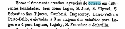 Es scheint, erst 1875 wurde der Postbetrieb in Tijucas wieder aufgenommen, wie im Bericht des Provinzpräsidenten für März 1876 vermerkt wurde:
