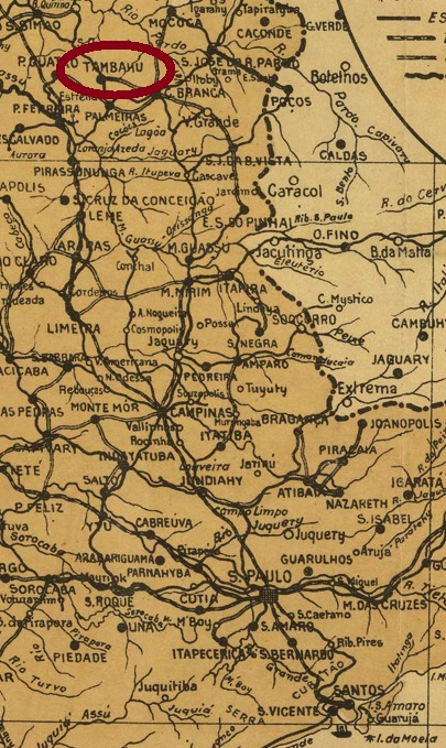 Inaugurated in October 1887 by the Cia. Mogyana railway company, Tambahu station (now spelled Tambaú) was located on the main line in the Município of Casa Branca, 260 km north of the provincial capital São Paulo. And it remained that way until it was closed in 1959. Around the station, the settlement grew to become a district in 1892, a vila in August 1898, and Tambaú has been a town since December 1906.