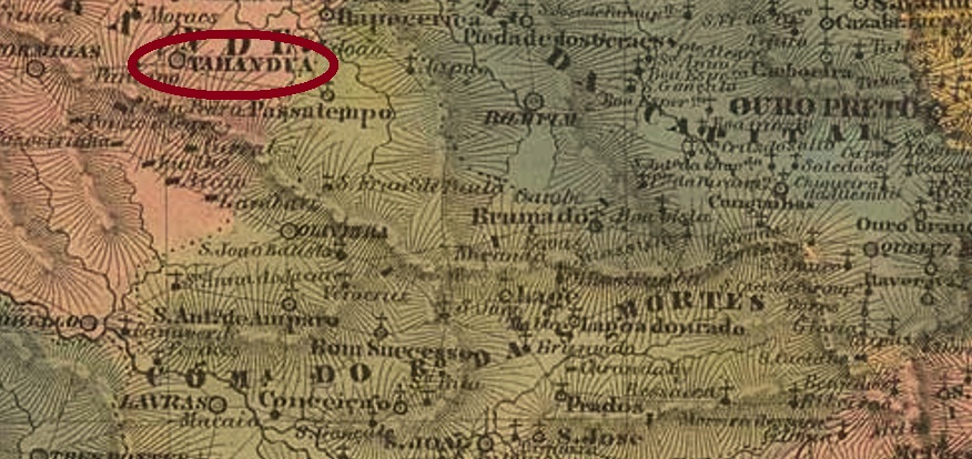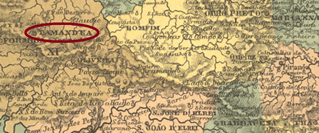 Two creation dates for the local post office were found. A sure indication that it was closed in the meantime. First in May 1858, as Nova Monteiro writes in Administrações e Agencias Postaes do Brasil Imperio (in Brasil Filatelico/RJ, 1934-5; Reprint SPP 1994-1999). Then again in 1873, as shown in the postal report (Relatório Postal) of December 1886. A postmark of the second period of operation was found. TPE-0615b (Coll. José A. Junges) is a plain double circle with the above inscription TAMANDARÉ. All specimens were found on Southern Cross issues from 1890.