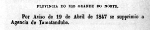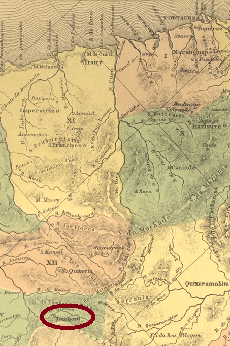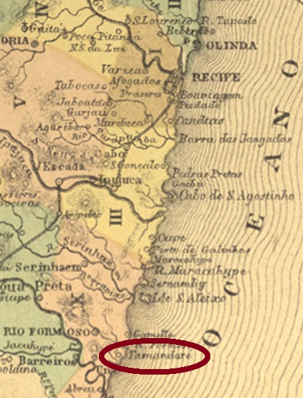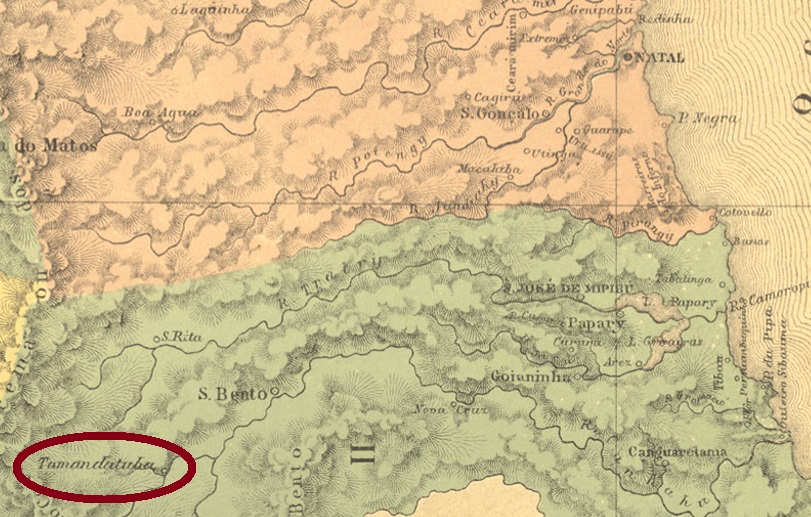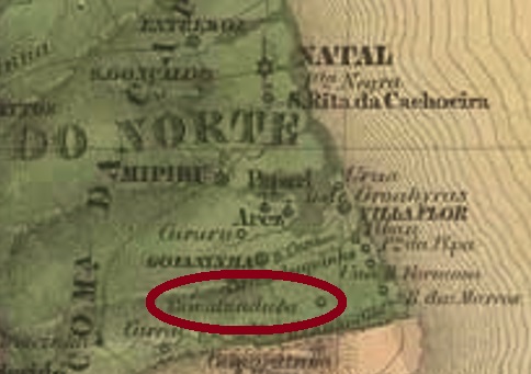 Tamatanduba is another settlement in 19th century Imperial Brazil that has since disappeared from the map. This settlement was probably a sugar cane fazenda in the freguesia of Villa Flor near Canguaretama, more than 90 km south of the provincial capital of Natal. At the beginning of the republic, the superior district was called Cuitezeiras, then Pedro Velho from November 1908. The Indian word Tamatanduba is said to mean hard-shelled fruit. All that remains of the former village today is the ruined chapel: