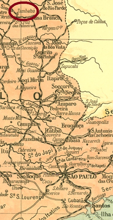 The 19th century postmark is TSP-1400a (image from the internet): a double circle with the inscriptions EST. TAMBAHU above and S. PAULO below. The only example so far bears a date from 1894 in the centre.