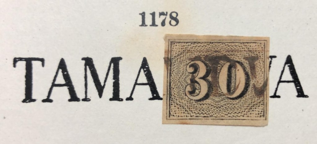 Der Poststempel des 19. Jahrhunderts ist TSP-1400a (Abb. aus dem Internet): ein Doppelkreis mit den Inschriften EST. TAMBAHU oben und S. PAULO unten. Das bisher einzige Exemplar trägt ein Datum aus 1894 in der Mitte.