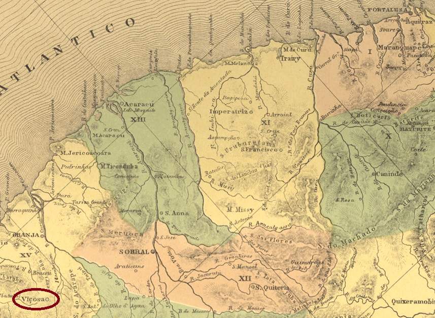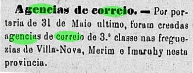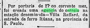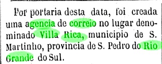 As can be read in the Directory of Imperial Post Offices (Tabella das Agencias do Correio do Imperio, Rio de Janeiro, 1885), there had been a post office there since 1870. The oldest postmark is the French type VBA-0765a (Coll. José A. Junges), which was used until at least 1876: the inscription at the top is VIÇOZA, and the small star between brackets can be seen at the bottom. It was followed by VBA-0845a (Coll. Dieter Kerkhoff): in this double circle the upper inscription is now VILLA VIÇOSA, below there is an (I), and the dates inside go from 1880 to 1894.