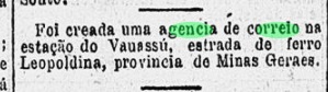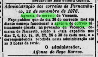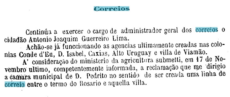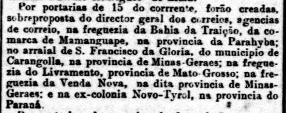 Two years of creation for the local post office have been found. First in 1873, as can be read in the Directory of Imperial Post Offices (Tabella das Agencias do Correio do Imperio, Rio de Janeiro, 1885) and also in the Postal Report (Relatorio Postal) for 1887. Then again in 1876, as shown in the regional press: