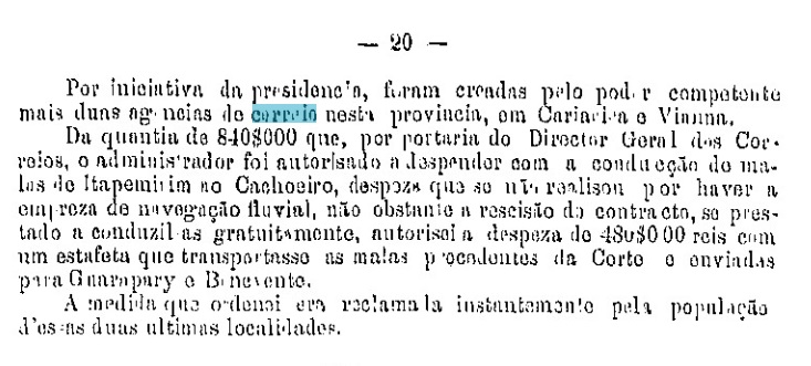 Zwei Gründungsjahre fürs örtliche Postamt wurden gefunden. Erstmals 1873, wie im Verzeichnis der kaiserlichen Postämter (Tabella das Agencias do Correio do Imperio, Rio de Janeiro, 1885) und auch im Postbericht (Relatorio Postal) für 1887 zu lesen ist. Dann wieder 1876, wie aus der Regionalpresse hervorgeht: