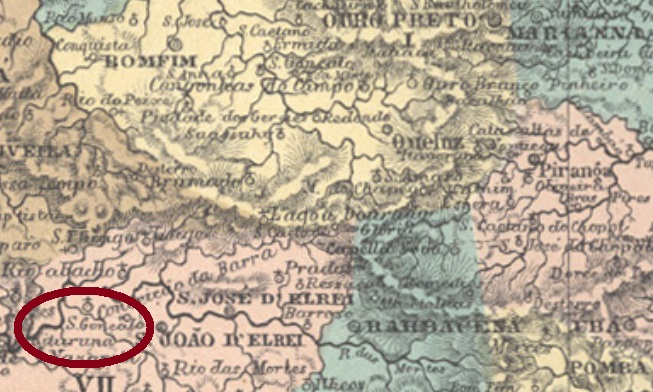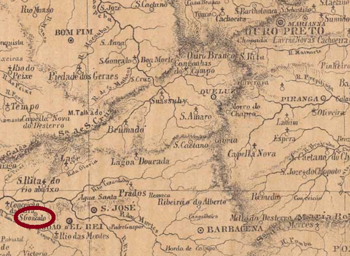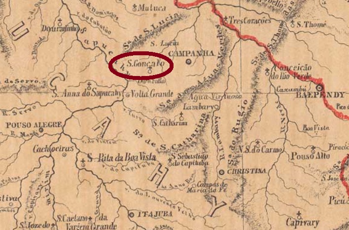From July 1819, this São Gonçalo in the province of Minas Gerais was a freguesia of Campanha, located not far from the eastern bank of the Sapucahy River, about 400 km southwest of the capital Ouro Preto. It was also called the São Gonçalo da Campanha do Rio Verde, which is misleading, since the Verde Rio is relatively close to Campanha, but quite far away from São Gonçalo. Perhaps for this reason, in October 1878, the village was renamed as S. Gonçalo do Sapucahy, and the very year after that, political emancipation came as an own municipality.