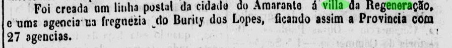 Die lokale Agentur wurde im Juli 1830 gegründet, wie Nova Monteiro in Administrações e Agencias Postaes do Brasil Imperio (Brasil Filatelico/RJ, 1934-5; Nachdruck SPP 1994-1999). Mit der Trennung des Ortes und dem Umzug nach Amarante wurde die Agentur wahrscheinlich geschlossen, da sie weder im Postführer von 1880 noch im Verzeichnis der kaiserlichen Postämter (Tabella das Agencias do Correio do Imperio) von 1885 enthalten ist. Es könnte 1885 wiedereröffnet worden sein, weil in diesem Jahr eine Postlinie zwischen Amarante und Regeneração geschaffen wurde: