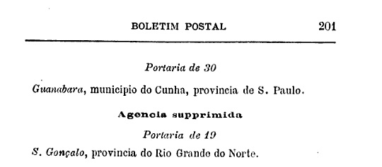 So far, no creation date has been found for the local post office. It is listed in the 1880 Postal Guide (Guia Postal do Império do Brazil), but it is no longer in the Imperial Post Register (Tabella das Agencias do Correio do Imperio) of 1885. Nor could any postmark of the imperial era be found.