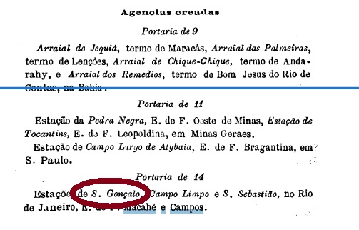 Der Bahnhof São Gonçalo wurde 1874 von der Gesellschaft Cia. Ferro-Carril Nictheroyense eingeweiht, ging aber bald danach in Besitz der E.F. Leopoldina-Bahngesellschaft in der sogenannte Küstenlinie (Linha do Litoral) über. Von 1975 bis Betriebsende 1996 gehörte die Linie der Rede Ferroviária Federal S. A. Heute dient der Bahnhof als Materiallager der Gemeinde, die Schienen wurden bereits entfernt (estacoesferroviarias.com.br). Das Bahnhofspostamt wurde im April 1874 ins Leben gerufen, wie die Presse aus Rio berichtet: