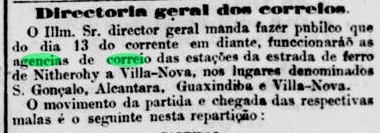 In 1874, a local train station was founded by the Cia. Ferro-Carril Nictheroyense, but soon after passed into the possession of the E.F. Leopoldina Railway Company in the so-called coastline (Linha do Litoral). From 1975 to operation end in 1996, the line belonged to the Rede Ferroviária Federal S. A. Today, the station serves as a material warehouse for the municipality, the rails having already been removed (estacoesferroviarias.com.br). The station post office was inaugurated in April 1874, as reported by the Rio press: