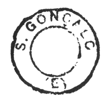 Wie Paula Sobrinho in História Postal de Minas Gerais (Belo Horizonte, 1997) schreibt, gibt es dort ein Postamt seit Oktober 1881. In Carimbologia S1 haben wir bereits den Stempel SMG-2315a vorgestellt (Abb. aus dem Internet): ein Doppelkreis mit der Inschrift S. GONÇALO DO PARÁ oben und einem Ornament in Rautenform unten, dessen vier Seiten offen sind. Inzwischen fand sich auch ein früherer Poststempel von dort. SMG-2315b (Samml. Fuad Ferreira Fo.) war aus einer D. Pedro-Ausgabe von 1883 zu sehen: